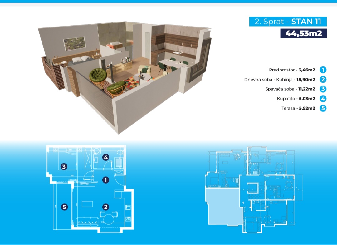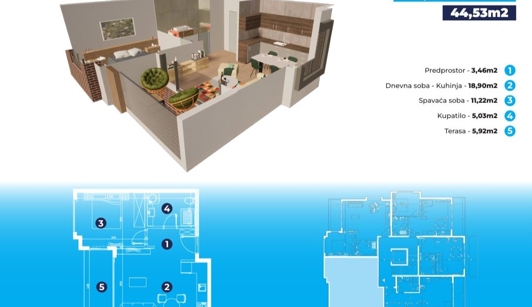 Stan koji vam predstavljamo se sastoji od prostrane dnevne sobe sa kuhinjom, odvojene spavaće sobe, kupatila i predivne terase.